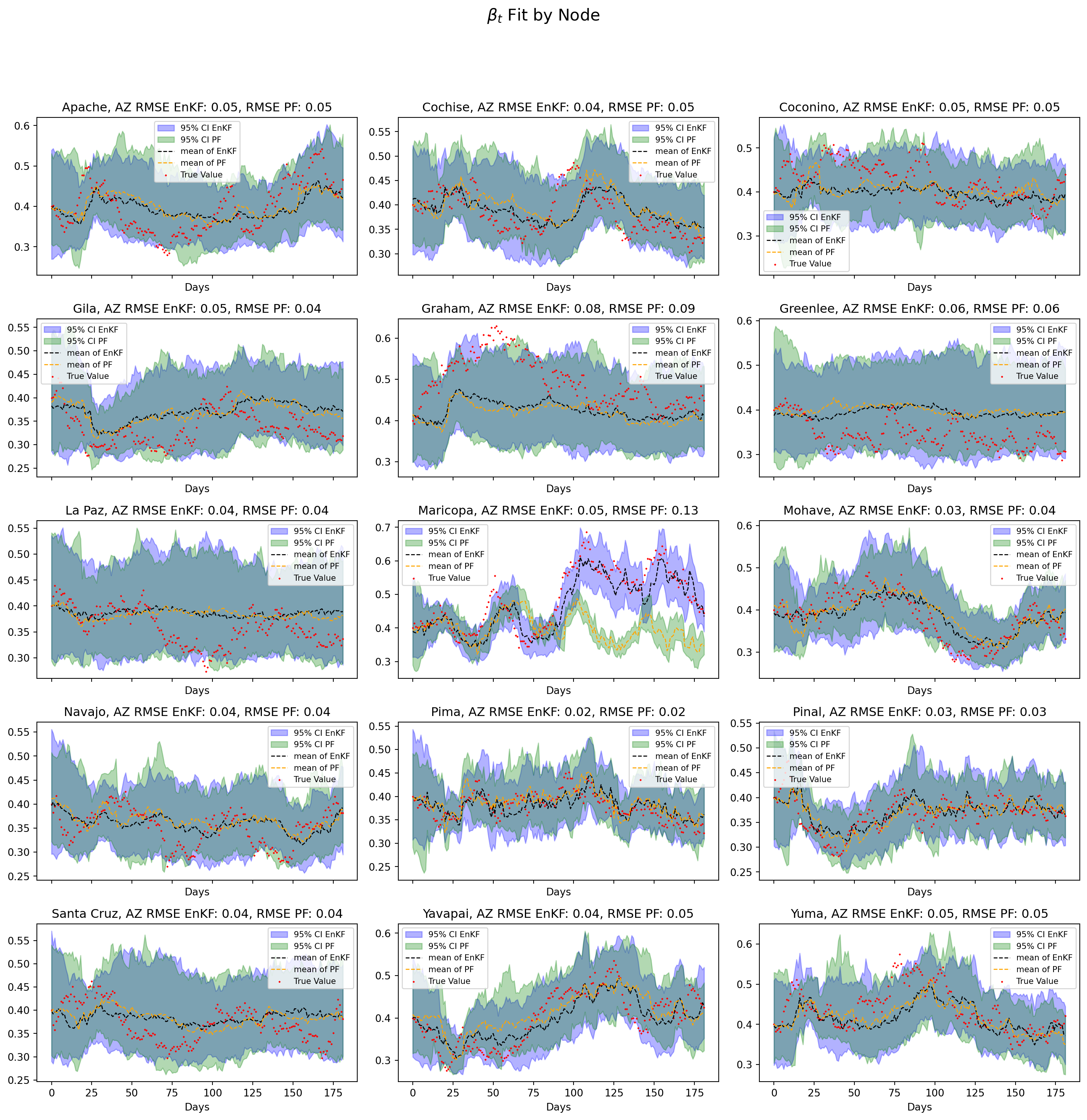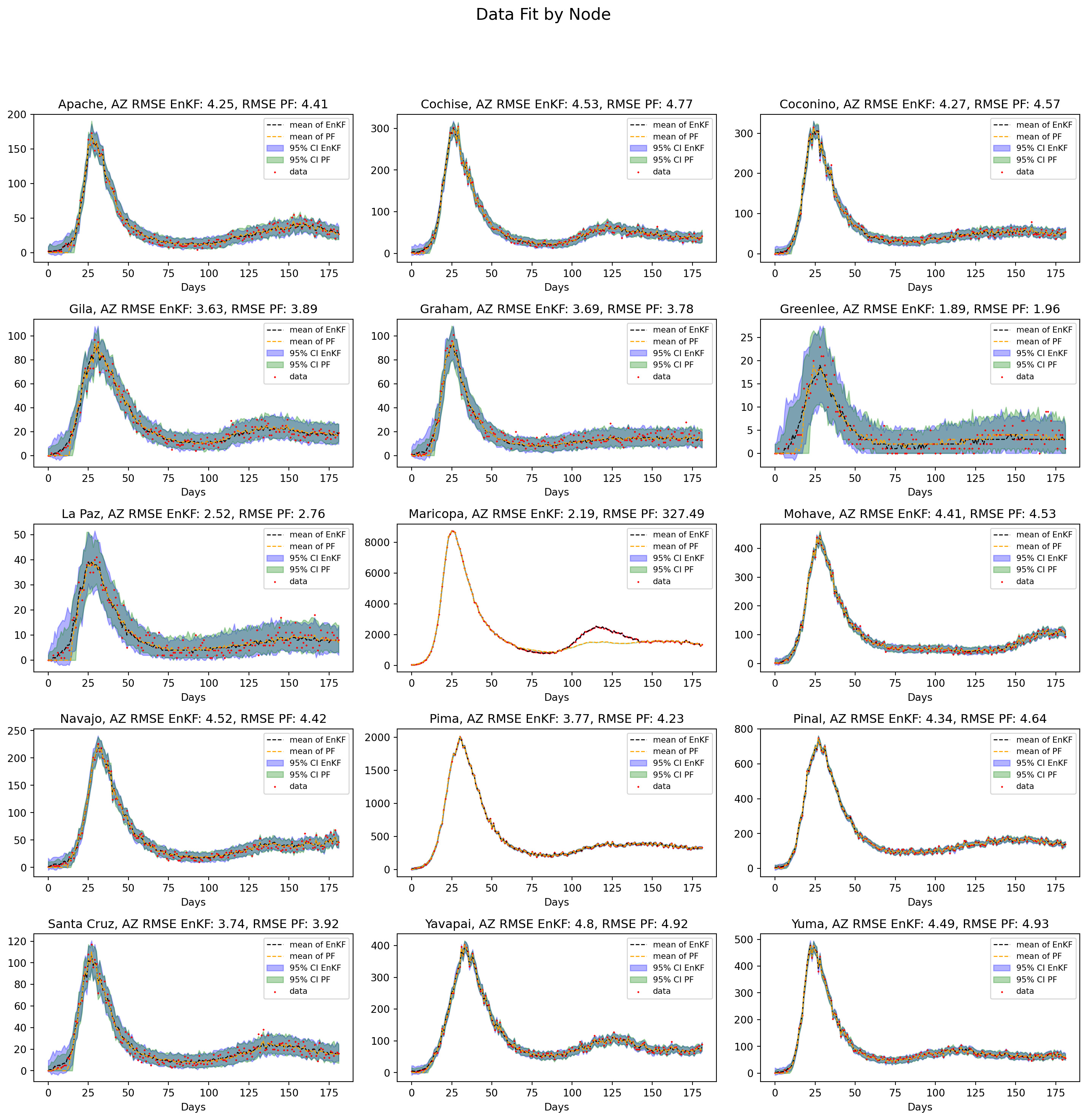 Both the PF and EnKF perform well overall, but the PF has divergence issues for Maricopa county. Due to the finite number of realizations in the PF this divergence can occur for high dimensional systems where PF effectively loses track of the state. The advantage of EnKF in this case is its ability to edit members of the ensemble to match the data, giving it much more flexibility.