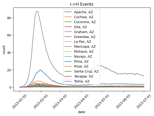 cases_arr = to_date_value_array(cases_df['time'].to_numpy(),cases_df['I → H'].to_numpy()).reshape(-1,rume.scope.nodes)num_realizations = 100